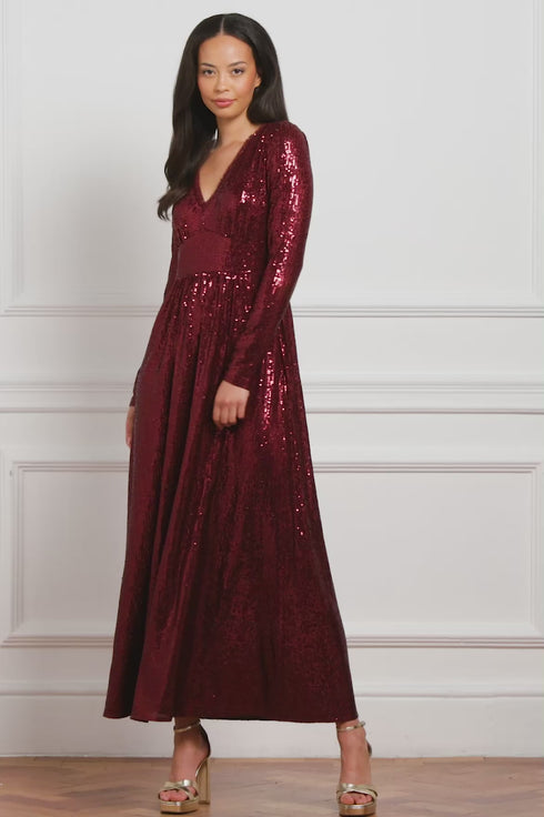 NEW SEASON | NEEDLE & THREAD EXCLUSIVE. The Chelsea V-Neck Gown in Claret. Sculpted with signature volume and lightweight layers, this design is both striking and comfortable. This piece pairs a refined V neckline with dramatic tulle tiers whilst the rich claret hue enhances its bold elegance, making it a standout piece for any event.