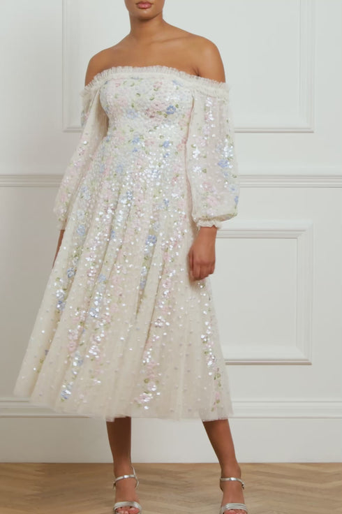 The Confetti Gloss Off-Shoulder Ballerina Dress in Cream / Multi. Beautifully decorated with sequin embellishment in soft flower motifs that scatter and disperse down this style in the most romantic confetti artwork. This off-shoulder style features elasticated arms adorned with soft tulle ruffles to add signature detail. The sleeves are designed using layers of tulle net for a soft yet structured look, and the skirt is crafted with tulle net for a sweeping hemline. The perfect piece for a special upcoming occasion.