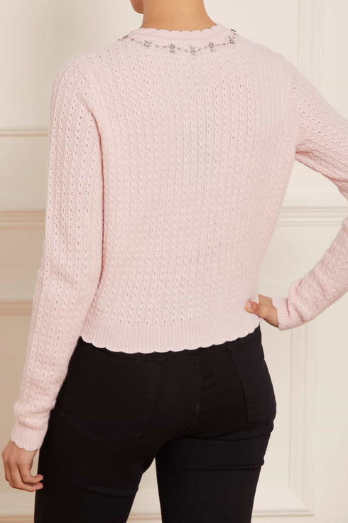 The Crystal Border Short Cardigan in Pink. This soft wool cardigan is decorated with delicate crystal embellishment, faux pearls, and diamante floral motifs creating feminine detail. Crafted with signature Needle & Thread scallop details, twisted cable stitch, and a ribbed neckline. Developed with slim fit sleeves, short in body length and a fitted silhouette. Make this cardigan your new wardrobe staple.
