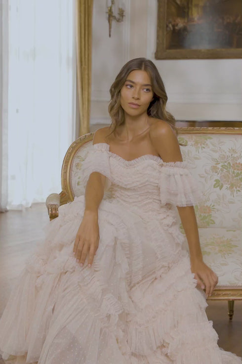 The Elia Off-Shoulder Gown in Dust Beige. This textile gown is beautifully designed with soft, delicate tulle ruffles that gradually increase in size towards the hem. Crafted with a romantic off-the-shoulder design and developed using layers of soft tulle trimmed with frills, adding to this statement look. The internal corset construction in stretch power-mesh ensures comfort and fit while maintaining the garment's shape and hold. The skirt is made up of generous layers of net and tulle with a sweeping hemline. Expect all eyes on you in this statement style.