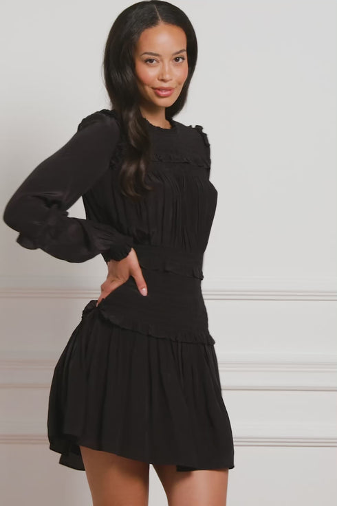 NEW SEASON. The Emilia Crepe Micro Mini Dress in Graphite. A playful and polished piece cut in a flattering A-line silhouette. This mini features a high neckline, long sleeves and soft draping through the bodice.