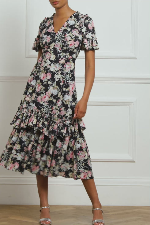 The Enchanted Eva Crepe Ballerina Dress in Graphite. A signature Needle & Thread print inspired by an archival hand-painted wallpaper design. This exquisite artwork brings to life a vision of romantic garden florals and historical motifs, beautifully translating the past into contemporary fashion. Inspired by 1930s tea dresses, it is adorned with elegant frills and offers an effortless, flattering fit with a V-shaped waist seam. The romantic fluted sleeves are detailed with frills, making this dress perfect for any occasion.