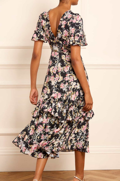 The Enchanted Eva Crepe Ballerina Dress in Graphite. A signature Needle & Thread print inspired by an archival hand-painted wallpaper design. This exquisite artwork brings to life a vision of romantic garden florals and historical motifs, beautifully translating the past into contemporary fashion. Inspired by 1930s tea dresses, it is adorned with elegant frills and offers an effortless, flattering fit with a V-shaped waist seam. The romantic fluted sleeves are detailed with frills, making this dress perfect for any occasion.