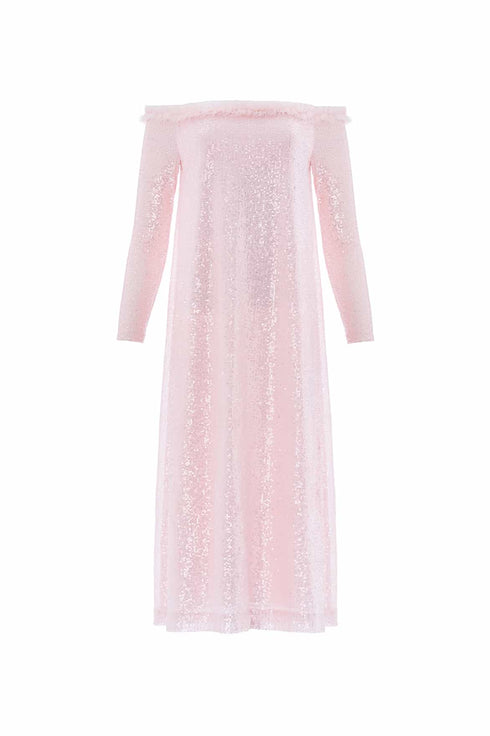 The Esme Off-Shoulder Ballerina Dress in Pastel Pink. The off-shoulder design features signature Needle & Thread tulle frills and a slim long sleeve for added elegance. The flattering A-line fit enhances the silhouette, while the tiny sequins create a shimmering effect with a high-shine, gloss finish. The dress also includes an internal corset made from stretch power-mesh for comfort and support. A timeless and elegant style, perfect for any special occasion.