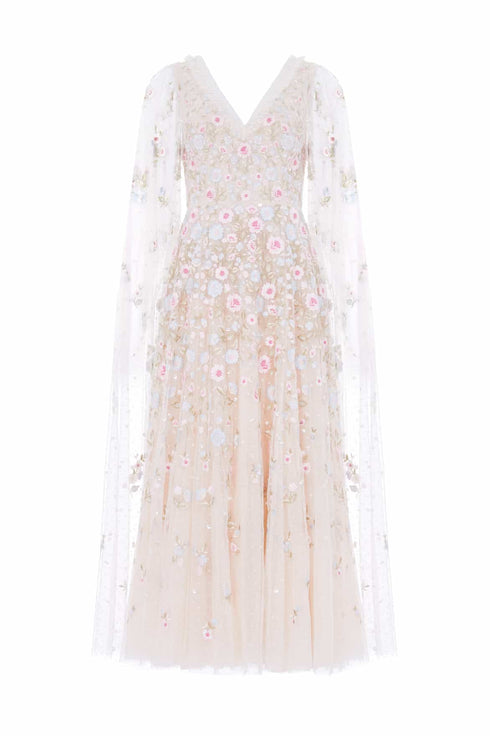 NEW SEASON. The Ethereal Blooms Cape Sleeve Ankle Gown in Cream/Multi. Decorated with soft floral embroidery in shimmering pastel tones. Designed with flowing cape sleeves and a gentle A-line silhouette, this gown embodies delicate femininity and effortless sophistication.