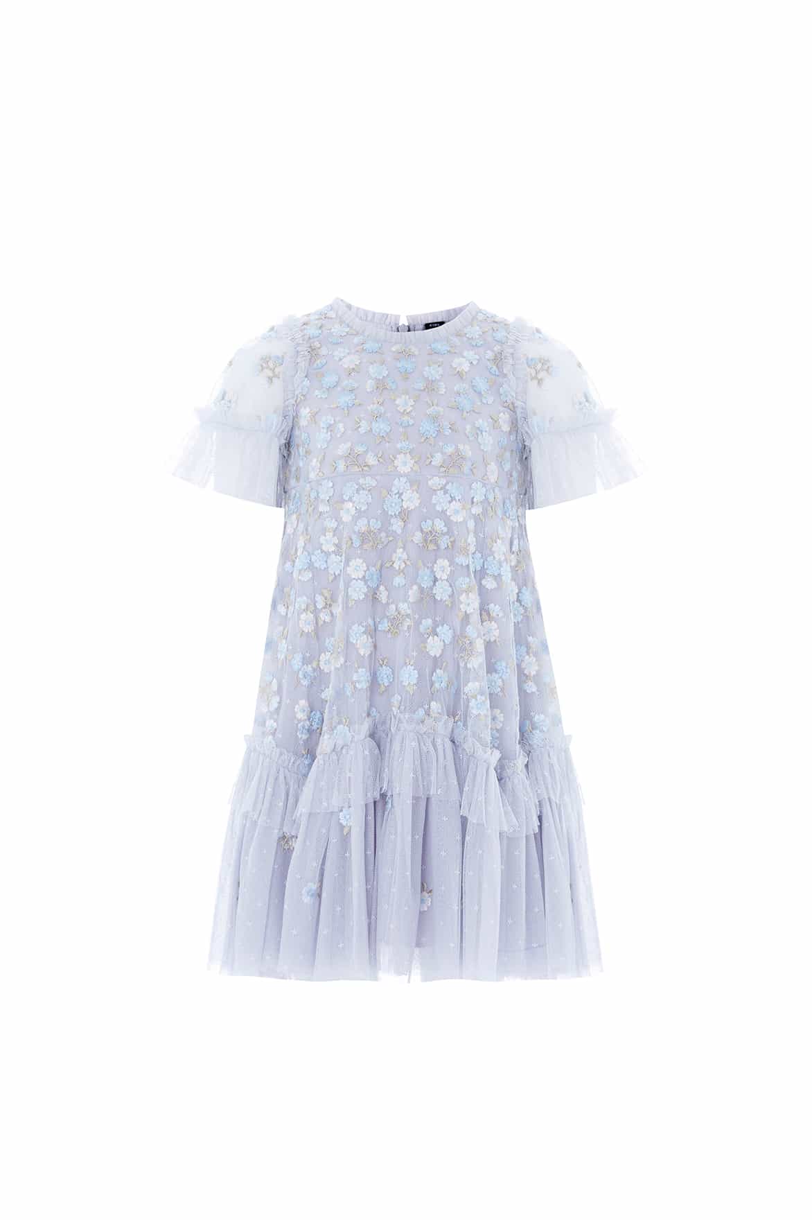 NEW SEASON. The Evening Primrose KIDS Dress in Cornflower Blue. This dress is decorated with intricate floral embroidery, inspired by a 1930’s tea dress. Beautifully engineered with chevron frills on the hem. Developed with our signature Needle & Thread tulle. The perfect dress for all your little one's upcoming occasions.