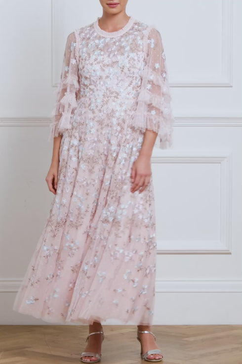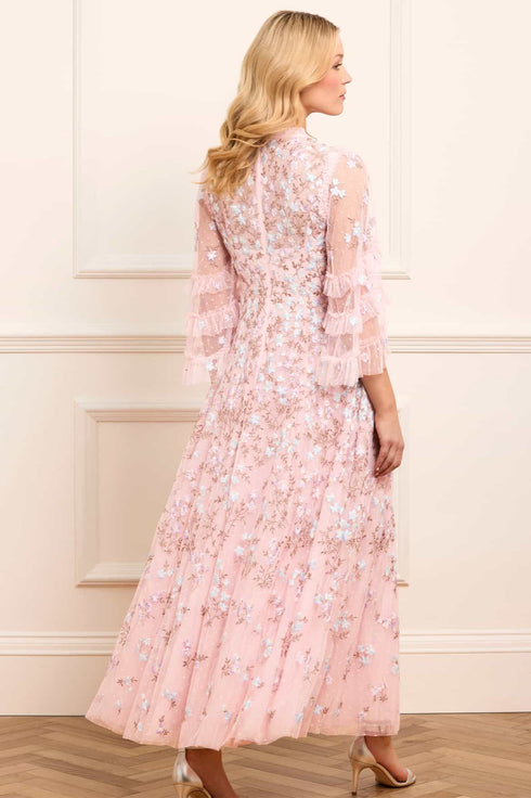 The Everett Bloom Round Neck Ankle Gown in Dusk Pink/Multi. This beautiful gown features exquisite, embroidered artwork inspired by a vintage archive print that showcases floating florals. Beautifully decorated with floral clusters cascading gently toward the hem, enhancing the romantic charm. Designed with fluted sleeves adorned with frothy tulle ruffles and embroidered floral motifs, while the neckline, shoulders, and cuffs feature signature Needle & Thread tulle frills for a touch of romantic elegance. The skirt is composed of generous layers of net and tulle, culminating in a sweeping hemline that adds to the gown's enchanting allure.