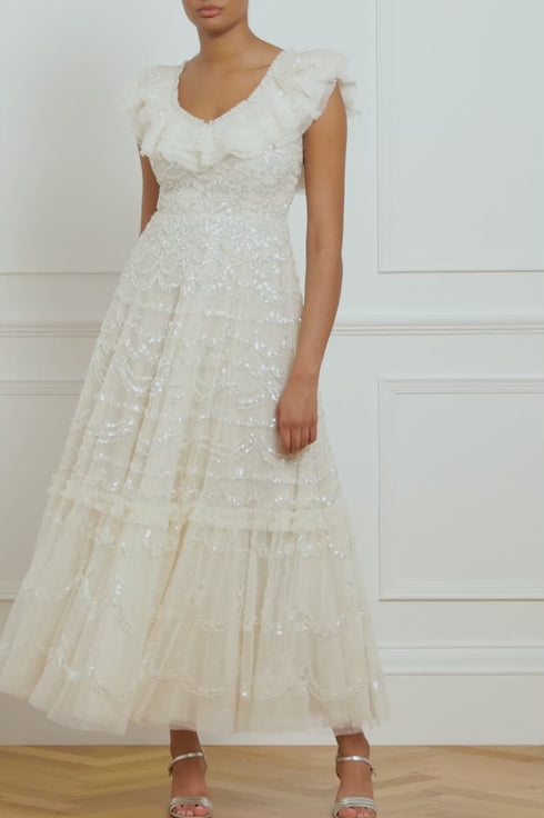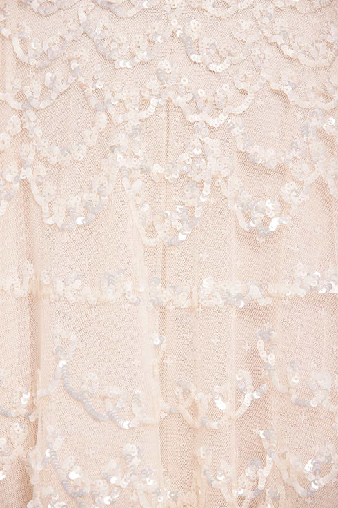 The Everthine Ankle Gown in Cream. This gown is inspired by the hand-scripted love letters of Beethoven, featuring the words 'ever thine ever mine ever ours' on a delicate border. Beautifully designed with intricate sequin artwork developed from the smallest sequin to capture the exquisite detailing. Designed with a vintage, couture-style neckline and adorned with layers of soft tulle and net to create a voluminous, show-stopping skirt shape. This romantic gown will be a piece you'll forever treasure.