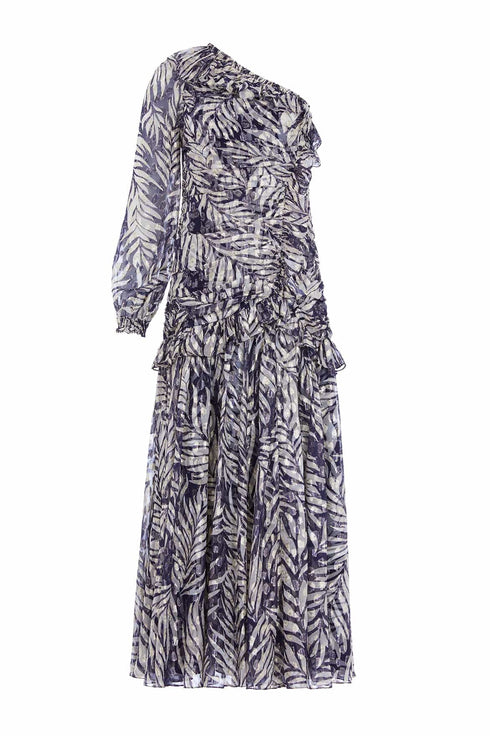 The Feather Lurex One-Shoulder Ankle Gown in Midnight/Beige. This ankle gown features a gold feather lurex print inspired by costumes worn by the Follie’s dancers of the early 1900s. The feather print is hand-painted in-house creating a subtle watercolour effect. This playful one-shoulder dress boasts a flattering gathered ruche detail engineered across the body and adorned with signature Needle & Thread frill detailing. Designed with a blouson sleeve featuring a ruffle cuff and romantic frills. The slim silhouette includes a dropped waist seam with a flirty frill tier. The stretch lining fabric ensures fit and comfort.