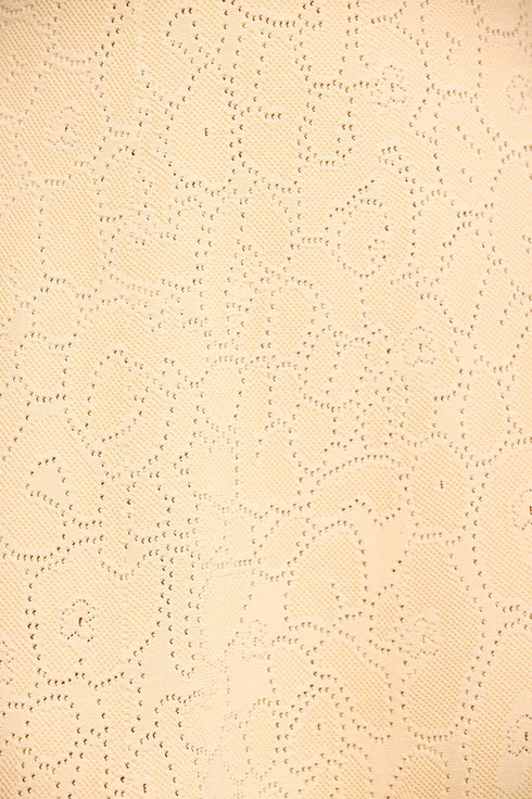 The Floral Pointelle Knit Gown in Buttermilk is crafted from a recycled viscose blend with stretch yarn for a beautifully flattering texture. Inspired by vintage lace, its stitch pointelle details showcase delicate floral motifs, adding a touch of intricate charm. The fitted stretch bodice features a feminine V-neckline and scalloped trim, enhancing the gown's romantic appeal.