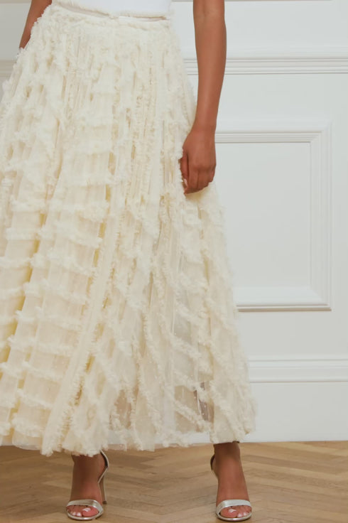 NEEDLE & THREAD EXCLUSIVE. Meet the Florence Ruffle Ankle Skirt in Champagne. This beautiful skirt is crafted with layers of kisses tulle, creating a voluminous romantic look. This ankle-length skirt is designed elegantly with a satin waistband and gathered neatly with tulle trims. Pair with your favourite knit and make an entrance this season.