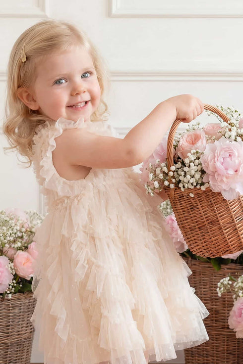 NEW SEASON. The Genevieve Baby Dress in Cream. Captures timeless Needle & Thread charm with tonal floral embroidery on soft tulle. With delicate gathers and flutter sleeves, this dress balances comfort and sophistication beautifully.