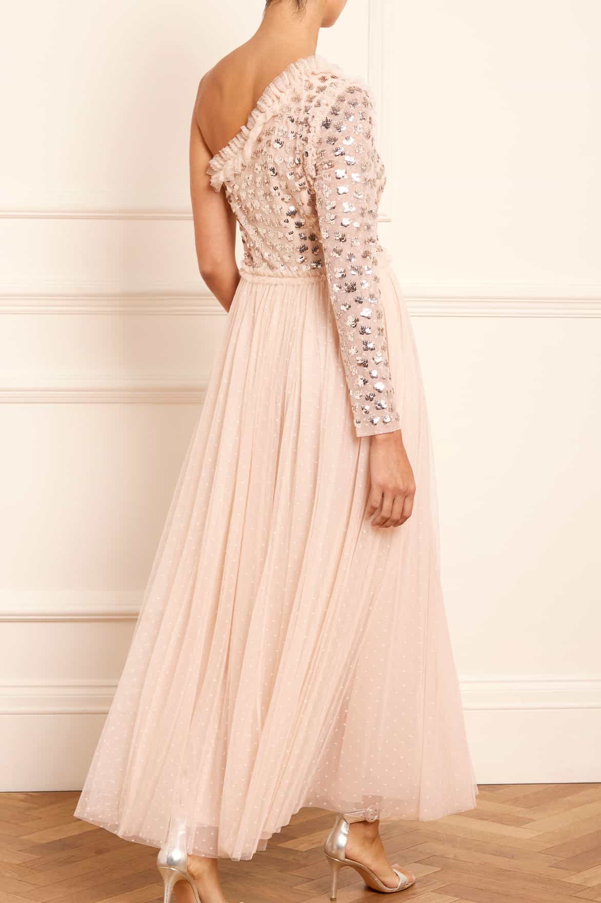 NEEDLE & THREAD EXCLUSIVE. The Glisten Bodice One-Shoulder Ankle Gown in Dust Beige/Silver. Beautifully designed with an elegant one-shoulder featuring signature Needle & Thread tulle frills at the neckline and waist. The bodice is adorned with delicate shimmering sequin motifs, while the slim-fitted sleeve are decorated with sparkling embellishments. The skirt features layers of signature Needle & Thread soft tulle for a romantic look. The perfect gown for an upcoming special occasion.