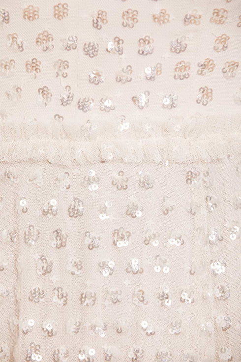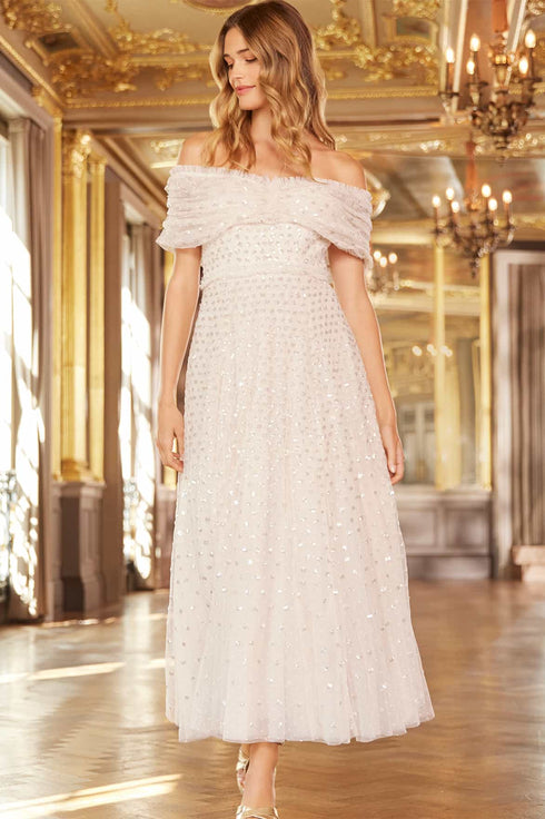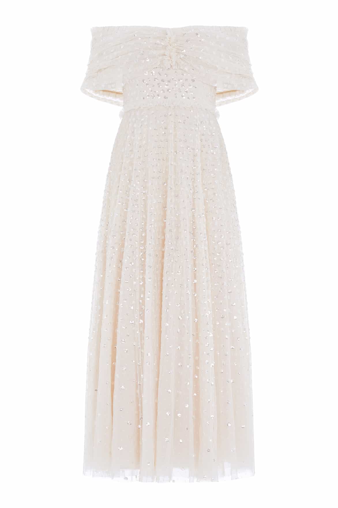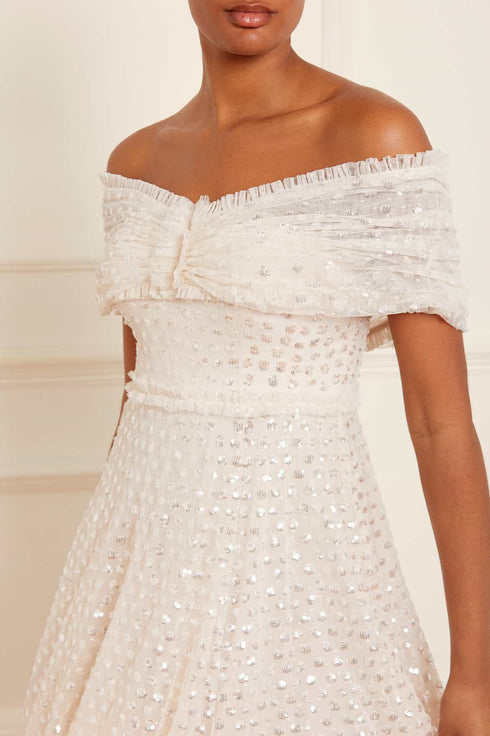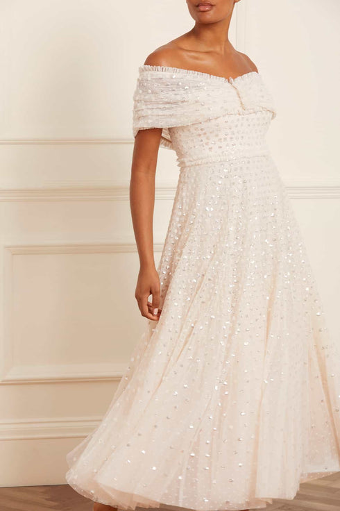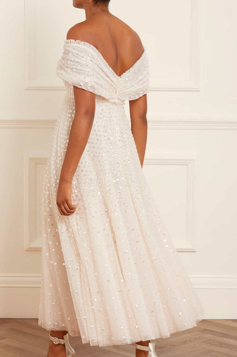 The Grace Gloss Off-Shoulder Ankle Gown in Cream / Silver. This gown is beautifully decorated with high-shine sequins in dot motifs creating an enchanting, shimmery effect. Crafted with an off-the-shoulder design inspired by iconic Grace Kelly, capturing the elegance of her look perfectly. Designed with an integrated corset for the perfect shape and structure. You'll forever treasure the Grace Gloss.