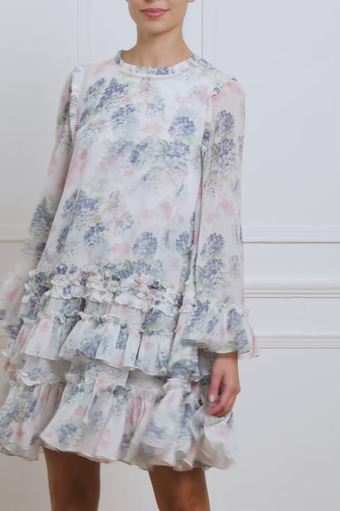 The Hydrangea Chiffon Round Neck Mini Dress in Moonshine. An exquisite statement print taken from the archive, this hand-painted artwork from the early 1900s depicts blooms of hydrangea flowers and smaller trailing florals, all rendered with a soft watercolour feel. The effortless, loose-fitting silhouette is crafted in soft chiffon, creating a romantic, floaty look. The semi-sheer chiffon fabric is complemented by a separate slip underneath, adding chic modesty to the design. Crafted with layered frills towards the hem showcase the Needle & Thread signature look, combining a relaxed yet statement style.