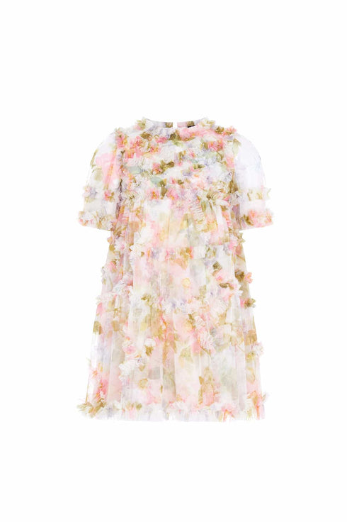 NEW SEASON. The Immortal Rose Maeve KIDS Dress in Moonshine. This dress is designed with a beautiful print, inspired from an antique early 1900's hand-painted artwork. Designed with the prettiest wild rose motifs in soft pastel pink, intertwined with vibrant green foliage. Developed with signature Needle & Thread textile tulle and delicate, gathered frills perfectly placed to add frothy texture throughout. The perfect wardrobe staple for your little one.