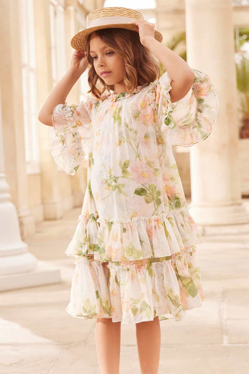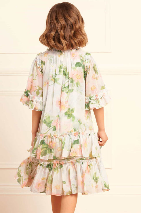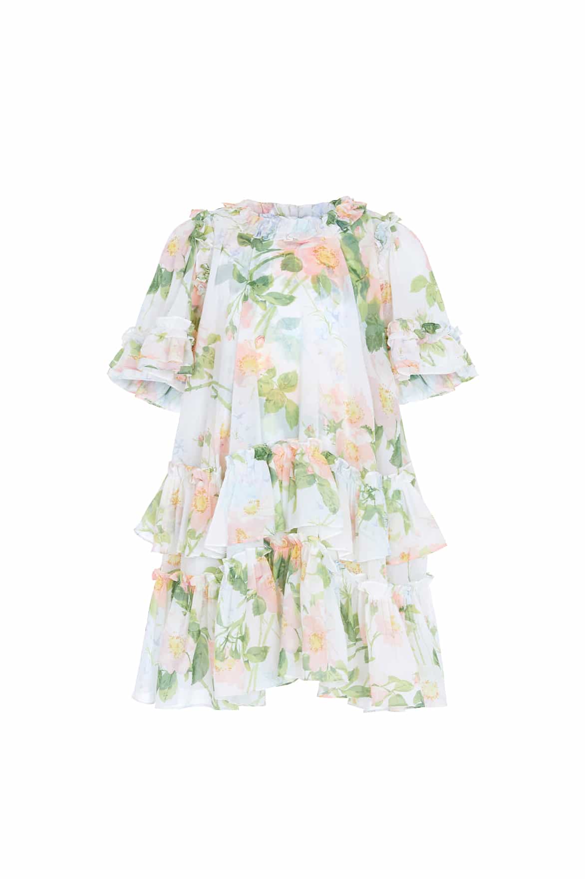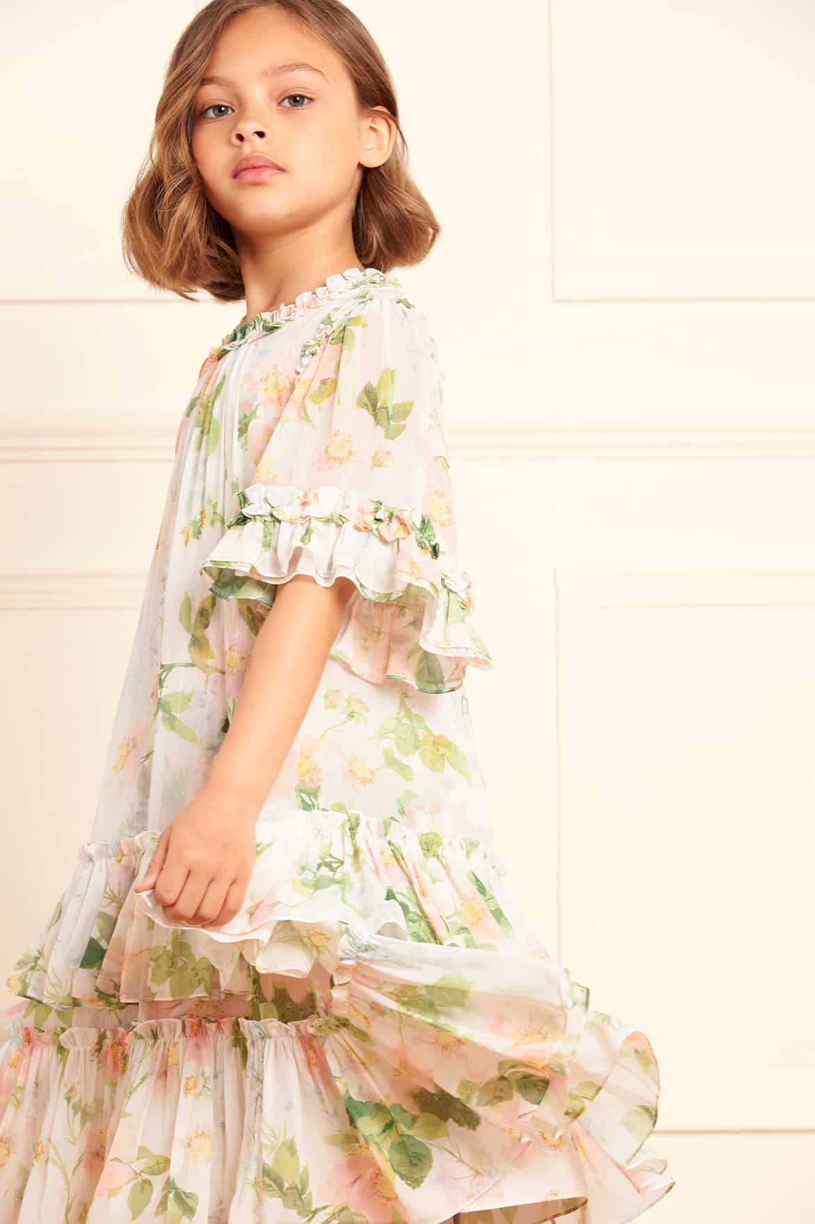 NEW SEASON. The Immortal Rose Sunny Chiffon KIDS Dress in Moonshine. This dress is designed with a beautiful print, inspired from an antique early 1900's hand-painted artwork. Designed with the prettiest wild rose motifs in soft pastel pink, intertwined with vibrant green foliage. Developed with a playful trapeze silhouette, featuring voluminous sleeves and softly gathered frill tiers. Created in our soft chiffon fabric for a floaty, fluid shape. The perfect everyday piece for your little one.