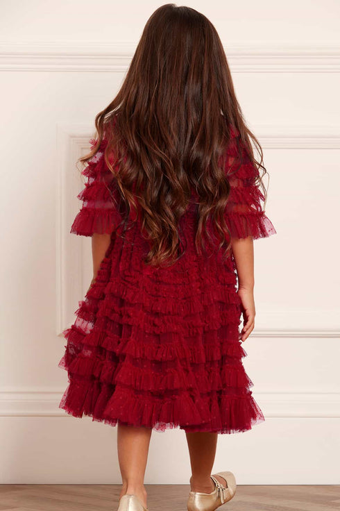 NEW SEASON. The La Vie En Rose Kids Dress in Deep Red. This beautiful dress is adorned with delicate tulle ruffles, engineered throughout the panels to enhance the silhouette. Crafted with gathered tulle to create a statement look. The perfect dress for all their upcoming special events.