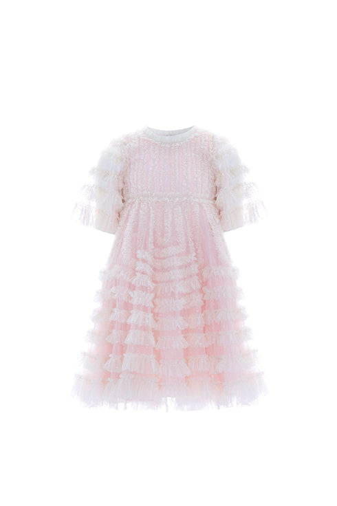 NEW SEASON. The La Vie En Rose Kids Dress in Peony Pink / Cream. This beautiful dress is adorned with delicate tulle ruffles, engineered throughout the panels to enhance the silhouette. Crafted with gathered tulle in a contrast colour to the base fabric creates a soft, gentle effect. The perfect dress for all their upcoming special events.