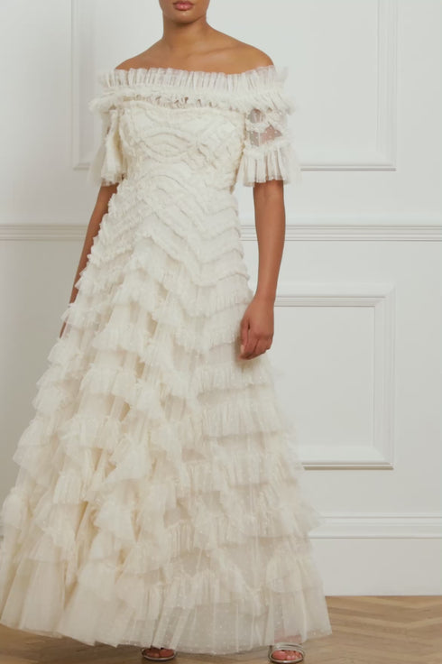 The Lana Off-Shoulder Gown in Cream. This beautiful gown is adorned with engineered tulle frills to create a romantic textile. Developed with an off-the-shoulder design featuring elasticated panels for comfort and fit. Beautifully crafted with layers of soft tulle for a whimsical, statement look. Expect all eyes on you in this magical Needle & Thread piece.