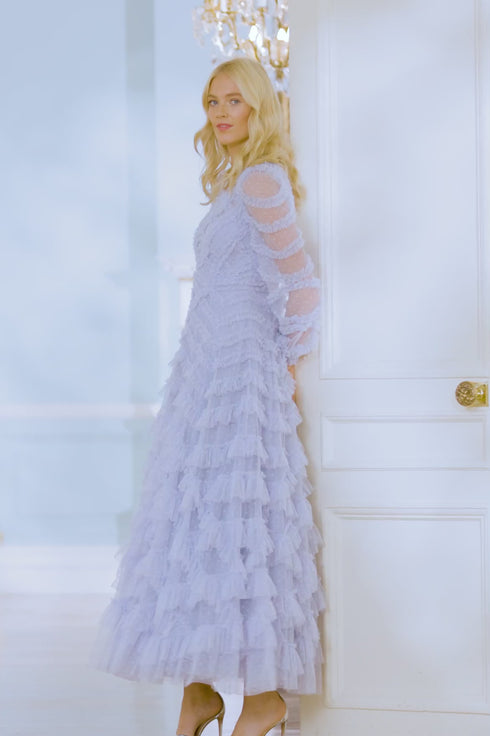 The Lana Round Neck Gown in Iris Blue. This beautiful gown is adorned with engineered tulle frills to create a romantic textile. Developed with a round neckline and long sleeves for an elegant look. Beautifully crafted with layers of soft tulle for a whimsical, statement texture. Expect all eyes on you in this magical Needle & Thread piece.
