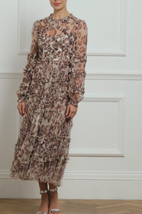 The Leopard Diamond Ruffle Ballerina Dress in Moonshine. This statement print was hand-painted in-house using watercolour, with soft leopard motifs varying in scale and featuring watery definition. Inspired by Victorian styling, this piece includes pretty engineered ruffle details and voluminous blouson sleeves with an elasticated cuff adorned with frill detailing. The skirt offers a flattering fit that skims the body and gently increases in fullness, creating stunning movement within the tulle. Make this piece your new wardrobe favourite.