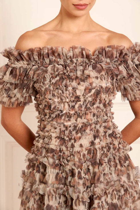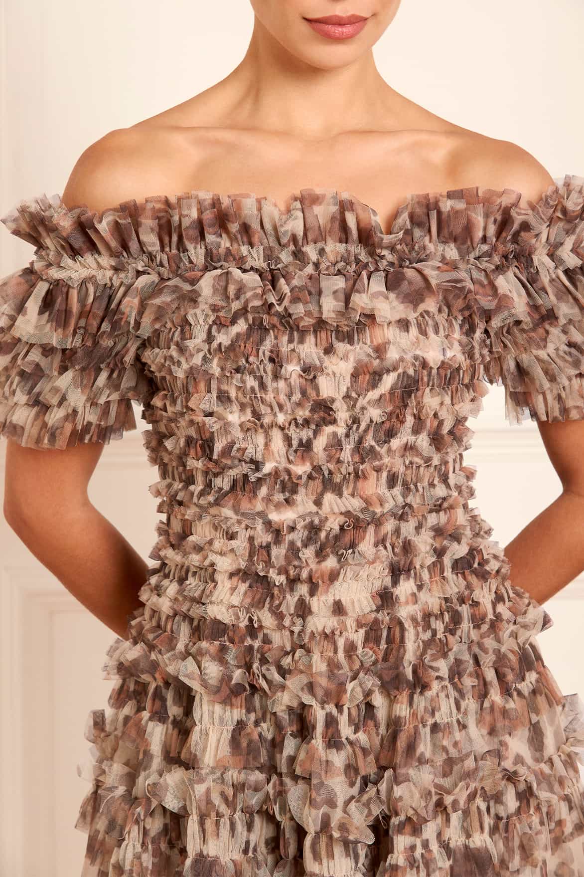 The Leopard Lisette Off-Shoulder Micro Mini Dress in Moonshine. This dress features a statement print that was hand-painted in-house using watercolour, with soft leopard motifs varying in scale and showcasing watery definition. This statement dress has an elegant off-the-shoulder design inspired by Hollywood styling. Crafted with textile tulle and double-stitched frills for a dramatic, romantic effect. Features an integrated corset for a perfect fit and to hold the silhouette. Expect all eyes on you in this romantic dress.