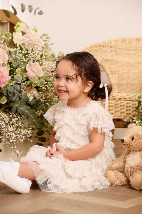 NEW SEASON. The Libby Lace Baby Dress in Cream. This pretty design features soft zig-zag tulle frills, delicate lace trims, and layers of signature tulle for a frothy, playful effect. Designed with whimsical frill sleeves and tulle accents on the neckline and shoulders add a charming touch. Lined in soft cotton voile for comfort, the set includes matching cotton dobby bloomers with frilled edges. Perfect for a special occasion, christening, or flower girl moment.