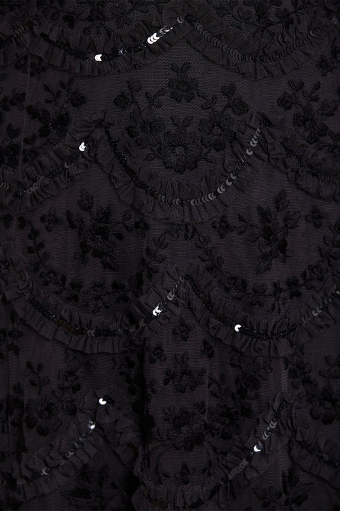 The Lily Bloom Ankle Gown in Graphite. This ankle gown is beautifully designed with delicate tulle ruffles and soft scallop shaping for signature Needle & Thread styling. Adorned with intricate white floral embroidery and trimmed with a high shine sequin adding shimmer throughout. Make the Lily your new wardrobe addition.