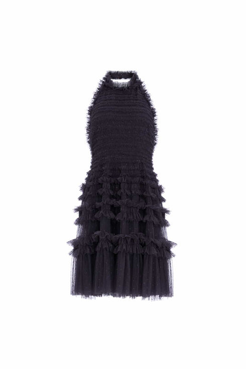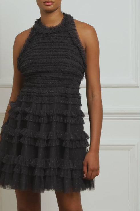 The Lisette Ruffle Halter Neck Micro Mini Dress in Graphite. A brand new shape for the season ahead. Crafted with an elegant halter neck and backless design. Beautifully engineered with signature Needle & Thread textile, delicate tulle panels and perfectly placed frills. Designed with a generous sweeping hemline made from layers of tulle and net to create a romantic silhouette. Make an entrance in this show-stopping dress.