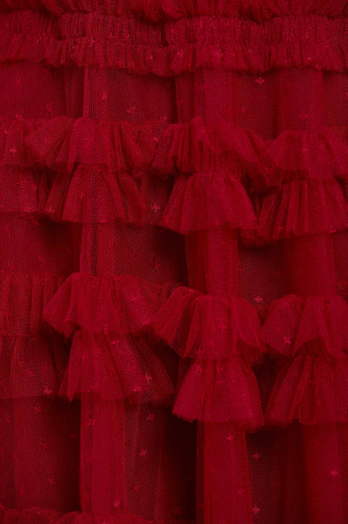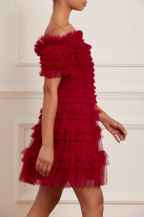 The Lisette Ruffle Off-Shoulder Micro Mini Dress in Deep Red. This statement dress has an elegant off -the-shoulder design inspired by Hollywood styling. Crafted with textile tulle and double-stitched frills for a dramatic, romantic effect. Designed with an integrated corset for a perfect fit and to hold the silhouette. Expect all eyes on you in this romantic dress.