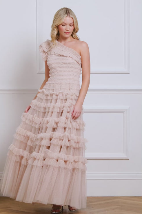 The Lisette Ruffle One-Shoulder Gown in Pearl Pink combines elegance and romance. Featuring a one-shoulder silhouette and soft tulle ruffles, it showcases Needle & Thread’s signature style with frills that graduate in size towards the hem. The skirt, crafted from layers of net and tulle, flows into a sweeping hemline, ensuring all eyes are on you.