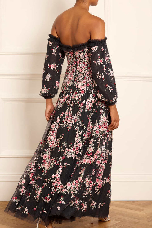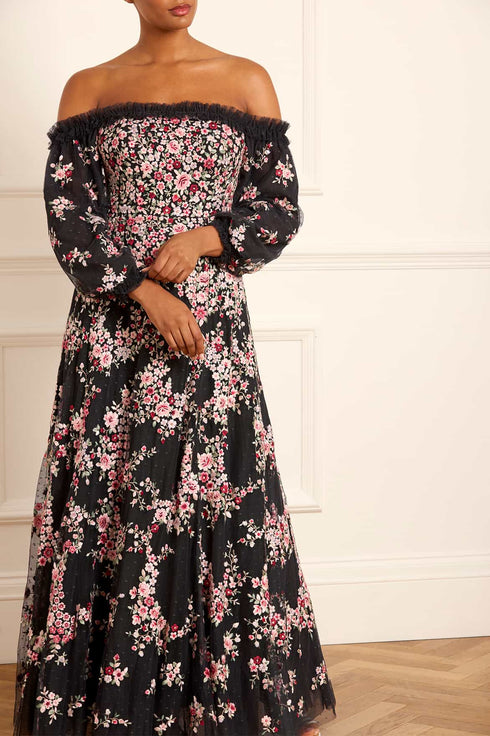The Lunaria Wreath Off-Shoulder Long Sleeve Gown in Graphite/Multi. This beautiful style is embroidered with delicate florals in a scattered garland artwork, inspired by an early 1900s design. Designed with rich, pastel tones to create the perfect painterly artwork. Crafted with an off-the-shoulder neckline for elegant styling and developed with a layered tulle net skirt for a signature Needle & Thread look. Let the Lunaria romance you this season.