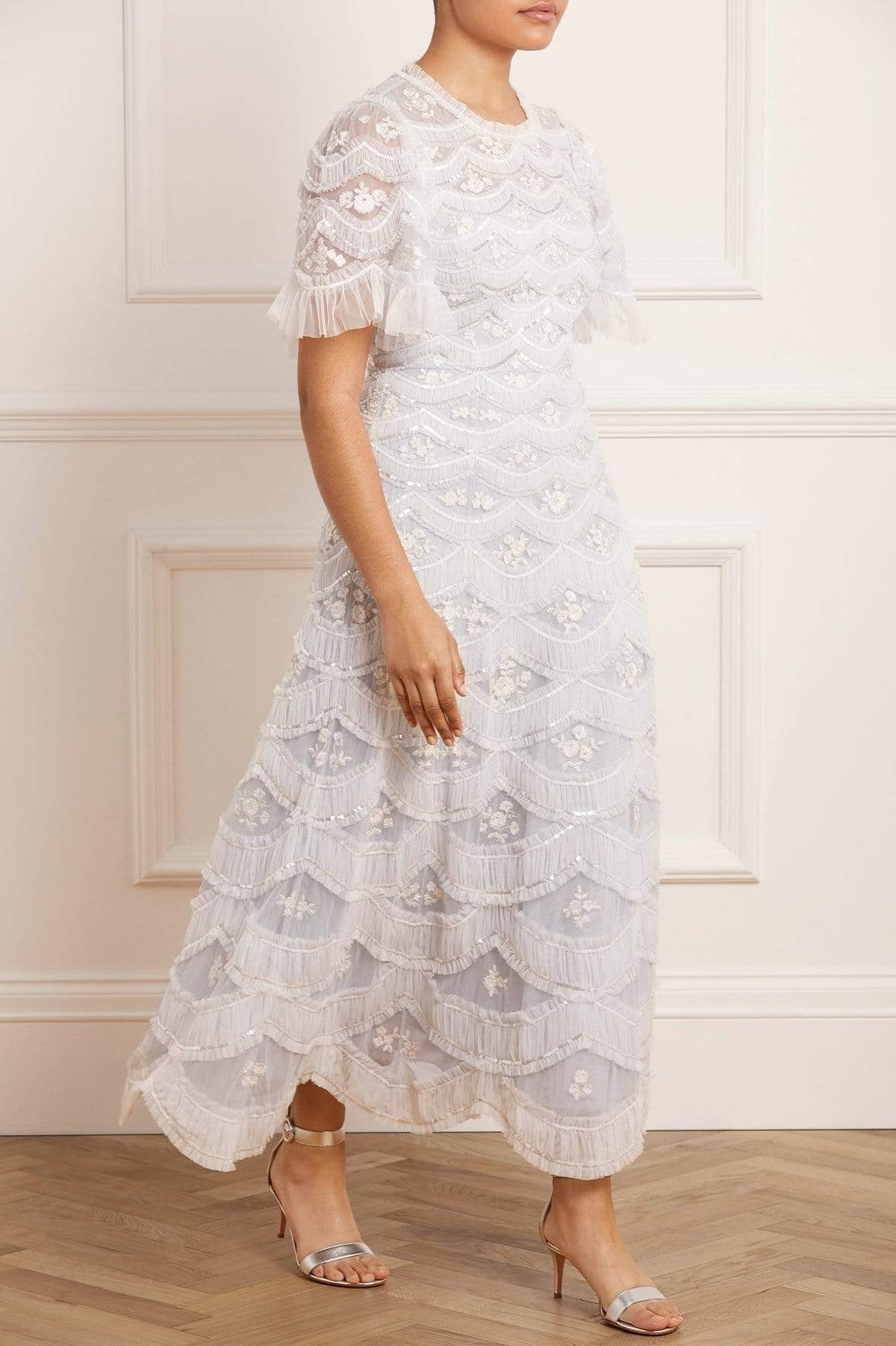 The Lunette Blossom Ankle Gown in Blue Mist This gorgeous gown is inspired by traditional Wedgwood ceramics, and is beautifully adorned with floral embroidery motifs, shimmering sequins and delicately gathered tulle scallop borders with contrasting ivory detail. Designed with pretty fluted sleeves, a flattering silhouette and a romantic aesthetic throughout. The perfect gown to take you from day to night.