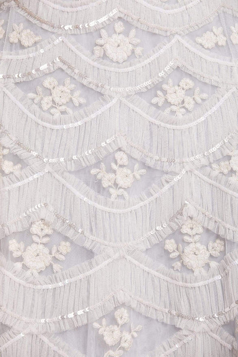 - Tulle decorated with tonal embroidery, iridescent sequins and gathered ruffles