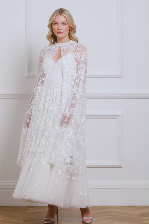 NEEDLE & THREAD EXCLUSIVE. The Maeva Midaxi Cape in Swan White reintroduces a signature Needle & Thread style with high-shine, glossy sequins for a lustrous finish. Developed with floral sequin motifs embellish the bodice and sleeves, while trailing floral borders gently fade towards the hem. Designed to layer perfectly with the Maeva Cami Ankle Gown, the cape features a frilled neckline and a hook-and-eye fastening, adding the perfect finishing touch.