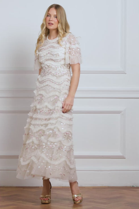 NEW SEASON. The Marina Ruffle Ankle Gown in Cream/Multi showcases delicate floral embroidery intertwined with soft frill detailing. Crafted from layers of tulle, this gown moves beautifully, capturing the spirit of feminine grace.