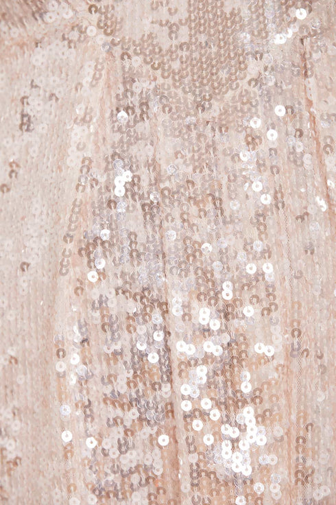 The Mila Gloss Mini Dress in Cream. This magical piece is designed with specially sourced gloss sequins creating an extra sparkle effect. Developed with perfectly placed panels and pleats to create an effortlessly, flattering silhouette inspired by a 1930's tea dress. Make a striking appearance in the Mila.