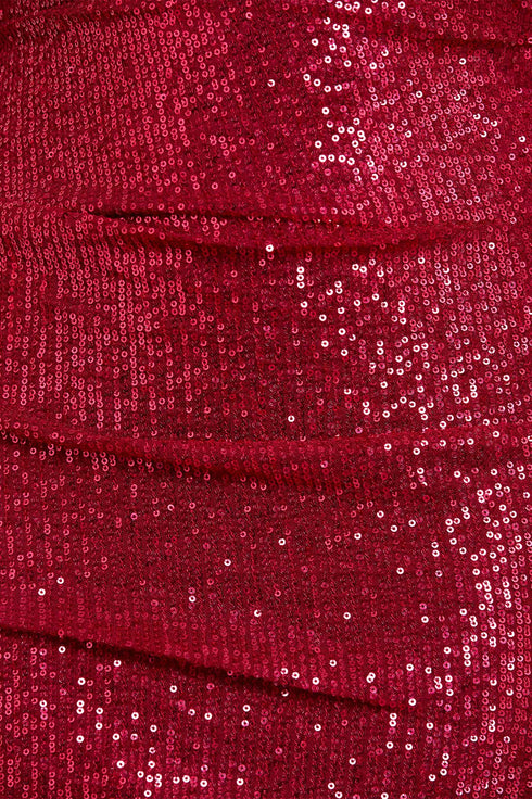 The Nova One-Shoulder Ankle Gown in Red. This gown is inspired by vintage Hollywood glamour. Beautifully designed with an elegant off-the-shoulder structure. Adorned all over with tiny glittering sequins for the ultimate statement. Crafted with a slim silhouette enhanced by soft drapes across the body, leading to a fluid sweeping skirt. The perfect romantic style for an upcoming special occasion. We hope you adore this new style as much as we do at Needle & Thread head office.