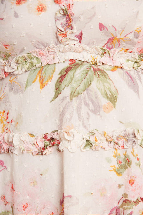 - Organic textured cotton decorated with floral print and cotton ruffles