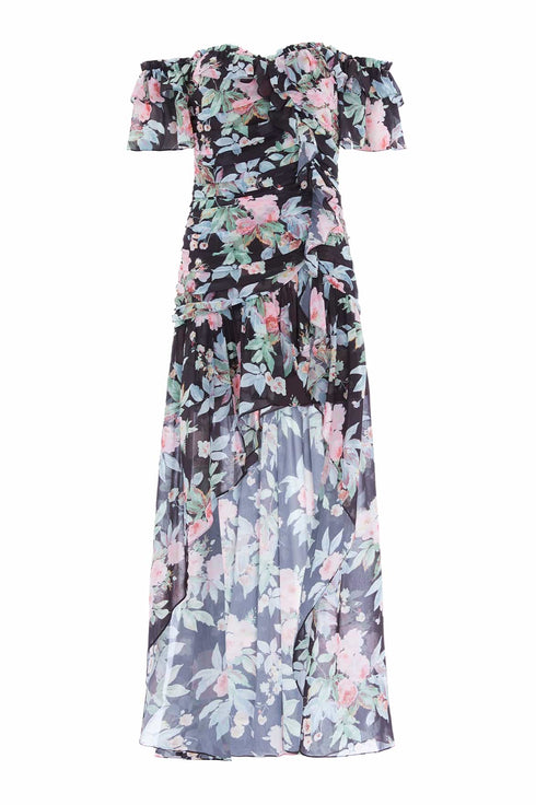 The Paradise Garden Susie Chiffon High-Low Dress in Graphite. The print of this dress is inspired by an enchanting paradise garden print, taken from an 1900s hand-painted artwork. This dress is designed with a luxe, twilight inspired colour palette in rich, lush floral motifs to create a truly alluring print. This high-low dress is developed in our soft, chiffon fabric with gentle gathers to create a drape around the body. Beautifully designed with a high-low, contemporary shaped skirt for a flattering yet playful silhouette. The perfect statement piece for an upcoming special occasion.