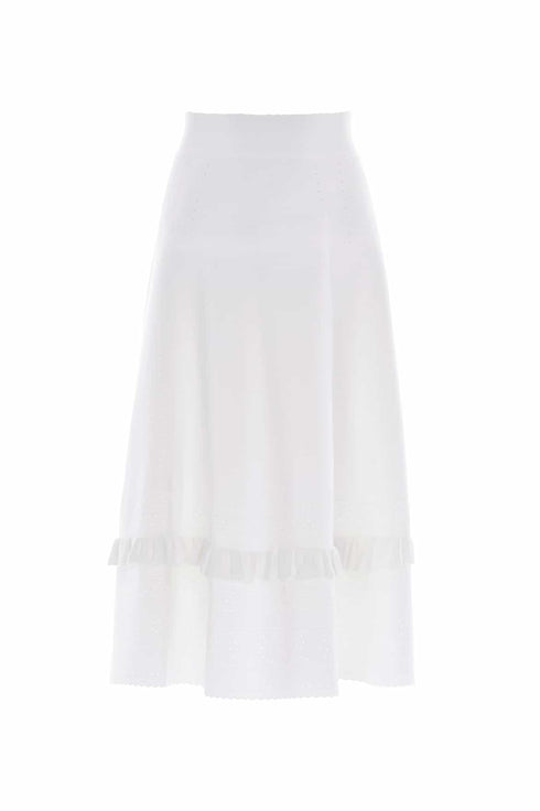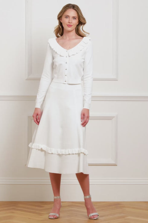 The Pointelle Trim Knit Skirt in Cream. This beautifully crafted skirt features intricate pointelle stitching, delicately adorning the hem and soft frill for a feminine, romantic finish. A flattering stretch waistband ensures both comfort and shape, while decorative pointelle detailing along the vertical seams adds subtle texture and elegance. Finished with a finely knitted scallop edge at the hem, this piece blends timeless craftsmanship with modern charm—perfect for elevated everyday styling or special occasions. Style with the Pointelle Trim Knit Short Cardigan for a beautifully coordinated look.