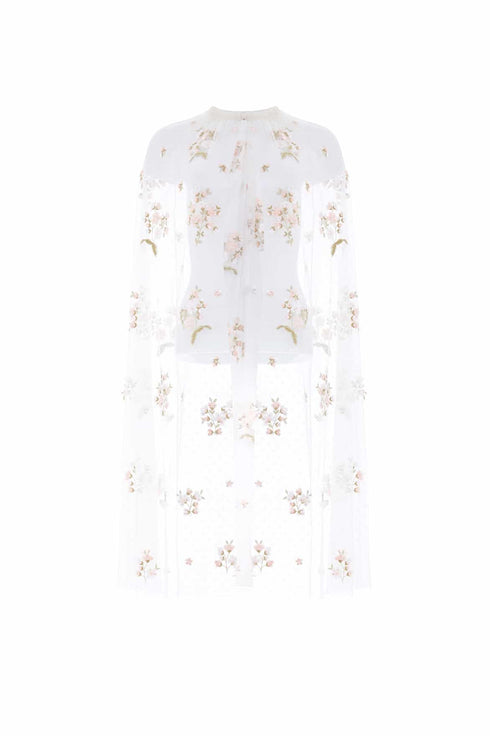 The Posy Midaxi Open Cape in Cream. This cape is adorned beautifully with clusters of intricate floral bouquets and shimmering sequins for a sparkling effect. This tulle cape is designed to style over the Posy Cami Gown and features a shaped edge at the front to reveal subtle gown detailing. The perfect styling piece.