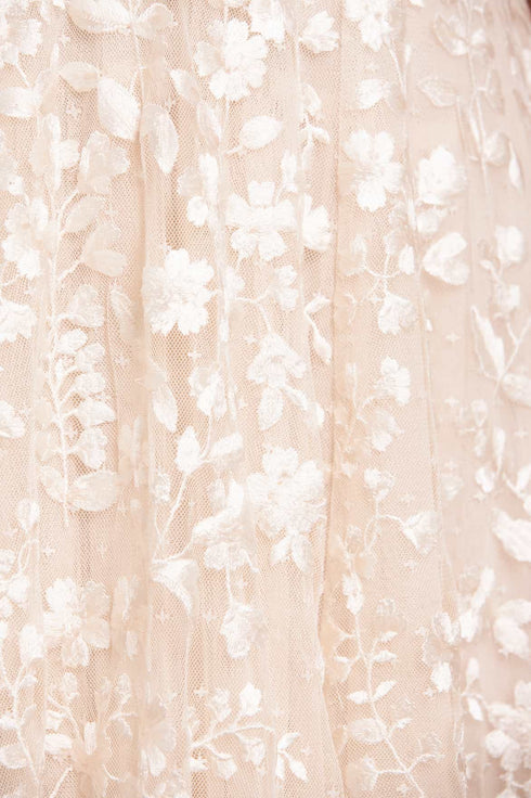 NEEDLE & THREAD EXCLUSIVE. The Posy Pirouette One-Shoulder Ankle Gown in Cream / Pink. A statement style for the season ahead. This gown is beautifully embroidered with intricate, rich posy florals scattered all-over and dispersing towards the hem. Developed with a one-shoulder design and adorned with soft, tulle ruffles adding a romantic finish. Crafted with a net tulle generous skirt with a sweeping hemline. A traditional yet stylish gown.