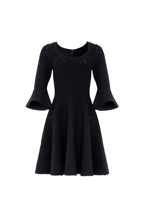 The Pretty Pointelle Knit Scoop Neck Mini Dress in Black. A brand new style for Needle & Thread. This knitted dress is inspired by vintage ditsy florals and lace. Beautifully designed with all-over pretty pointelle stitch, delicate florals and scallop details. This dress has a fitted stretch bodice with a soft, feminine neckline, fluted cuffs and signature Needle & Thread detailing. A truly flattering piece.