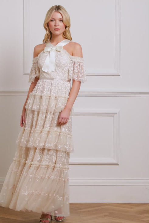 The Primrose Gown in Cream is a classic Needle & Thread design inspired by Victorian styling. Featuring a statement satin ribbon bow, delicate floral embroidery, and perfectly layered tulle frills on the skirt, this gown is a timeless and elegant piece.