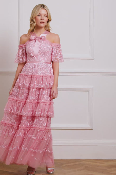 The Primrose Gown in Sugar Pink is a classic Needle & Thread design inspired by Victorian styling. Featuring a statement satin ribbon bow, delicate floral embroidery, and perfectly layered tulle frills on the skirt, this gown is a timeless and elegant piece.