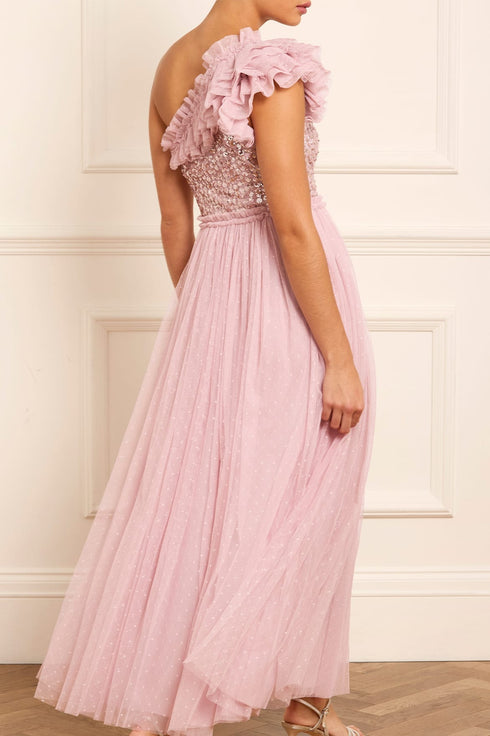 The Raindrop Bodice One Shoulder Ankle Gown in Sunflower. This bodice of this gown is beautifully adorned with an enchanting sequin artwork. The artwork is designed with delicate shimmering polka dot sequins in a linear formation capturing the essence of glistening raindrops. Designed with an off-the-shoulder style for elegant detailing. The skirt is made from layers of frothy tulle featuring statement frill details, creating a signature romantic look. The gown is perfect for a bridesmaid moment or an upcoming special event.