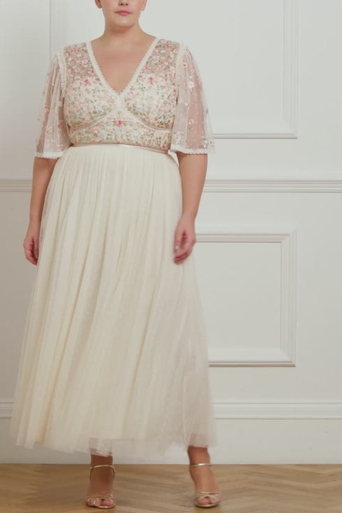 The Ribbon Bouquet Bodice Ankle Gown in Champagne / Pink Multi. The bodice of this gown is intricately designed with embroidered bouquets of flowers in rich tones, inspired by a 1930s vintage print. Beautifully adorned with delicate lace trims for signature Needle & Thread detailing. The skirt features layers of tulle to create a romantic silhouette. The perfect gown for an upcoming occasion.