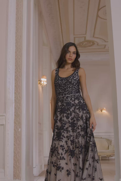 NEW SEASON. The Rosa Scoop Neck Ankle Gown in Graphite/Opal. This beautiful dress is a bold, elegant style featuring oversized rose motifs inspired by 19th-century archive paintings. With florals blooming across the bodice and softening into trailing ditsies at the hem, this gown flatters with a scoop neckline and a softly flowing skirt. Pair with the Rosa Hooded Cape for a truly romantic ensemble.